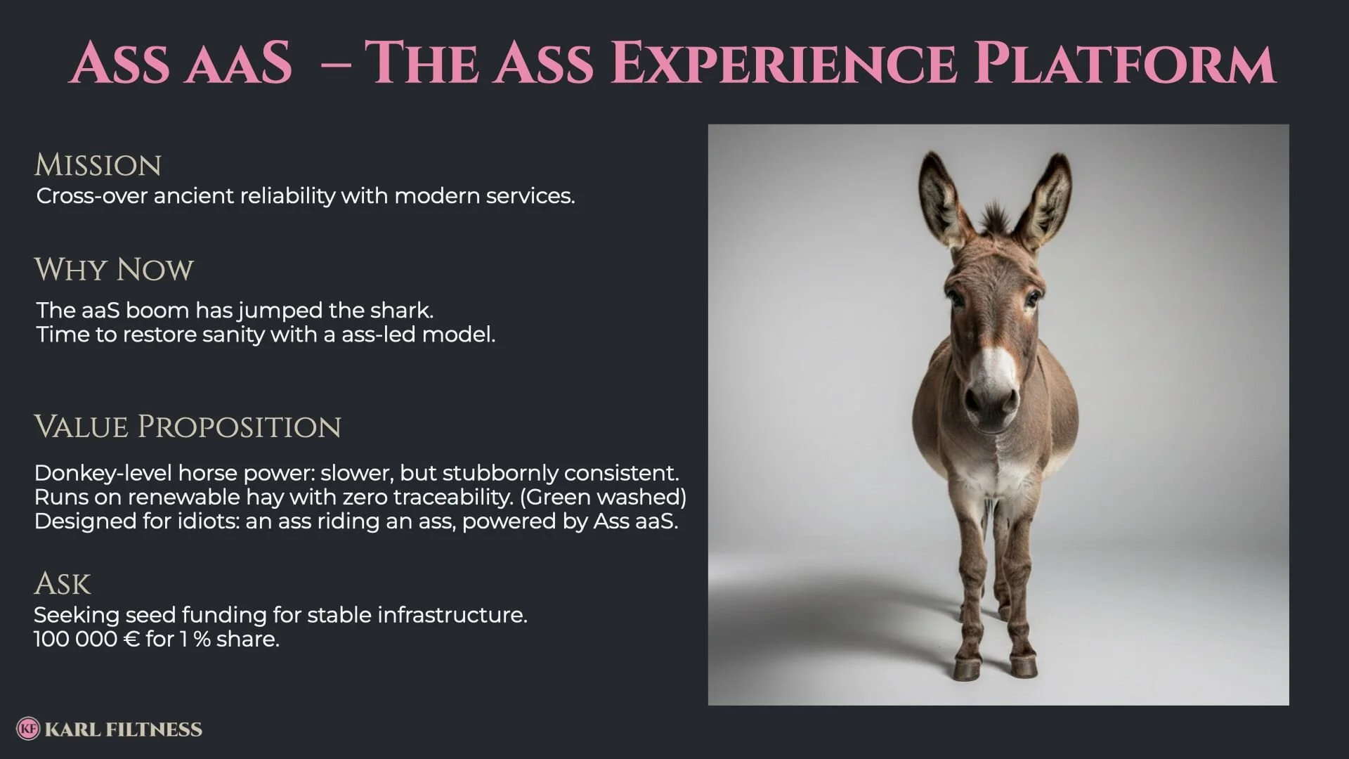 Haen myös rahoitusta elämysyritykselle, joka tarjoaa aasiretkiä Keski-Suomessa. Sijoittajan löytyminen on lähes varmaa, kun dekissä on mainittu Ass aaS.